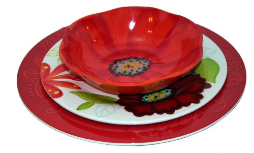 Laurie Gates Flora: 12 Piece Melamine Dinnerware Set. This heavy weight is durable, perfect for indoor and outdoor entertaining. Great set to mix & match together or with other sets. 100% Melamine Dinnerware Care: Dishwasher safe - top shelf only! (Not For Use In Microwave Oven!) Set Includes: Four - 11" Melamine Dinner Plates: 1 of Each in Red, Purple, Orange & Teal. Four - 9" Melamine Salad Plates: 1 of Each in a Floral Design with Red, Purple, Orange & Teal Flower. Four - .63 Qt Bowls 1 of Each in Red, Purple, Orange & Teal.Laurie Gates Flora 12PC Melamine Dinnerware Set Feature